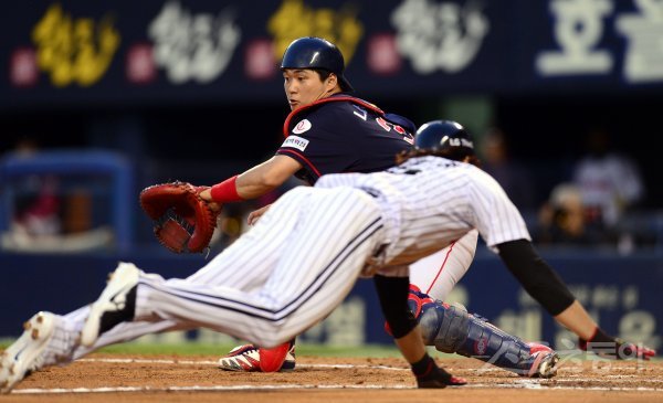 8일 서울 잠실야구장에서 ‘2018 신한은행 MY CAR KBO리그’ 롯데자이언츠와 LG트윈스 경기가 열렸다. 3회말 1사 1,3루 LG 박용택 좌익수 플라이아웃 때 3루주자 이형종이 태그업 시도해 홈에서 세이프 되고 있다.