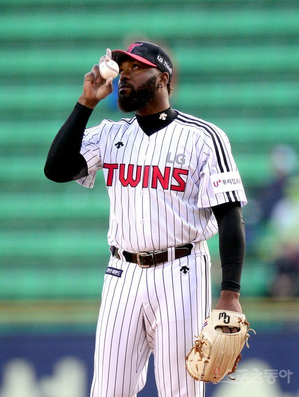 8일 서울 잠실야구장에서 ‘2018 신한은행 MY CAR KBO리그’ 롯데자이언츠와 LG트윈스 경기가 열렸다. 선발 투수로 등판한 LG 소사가 투구 전 승리의식(?)을 하고 있다.