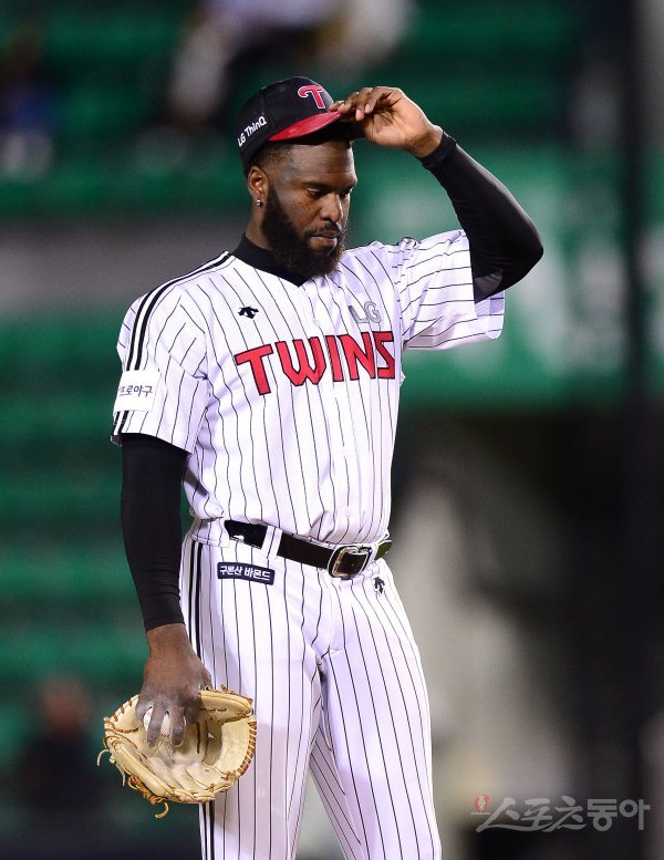 8일 서울 잠실야구장에서 ‘2018 신한은행 MY CAR KBO리그’ 롯데자이언츠와 LG트윈스 경기가 열렸다. 선발 투수로 등판한 LG 소사가 7회초 1사 2루 롯데 전준우에게 역전 1타점 중전 안타를 허용한 후 아쉬워하고 있다.