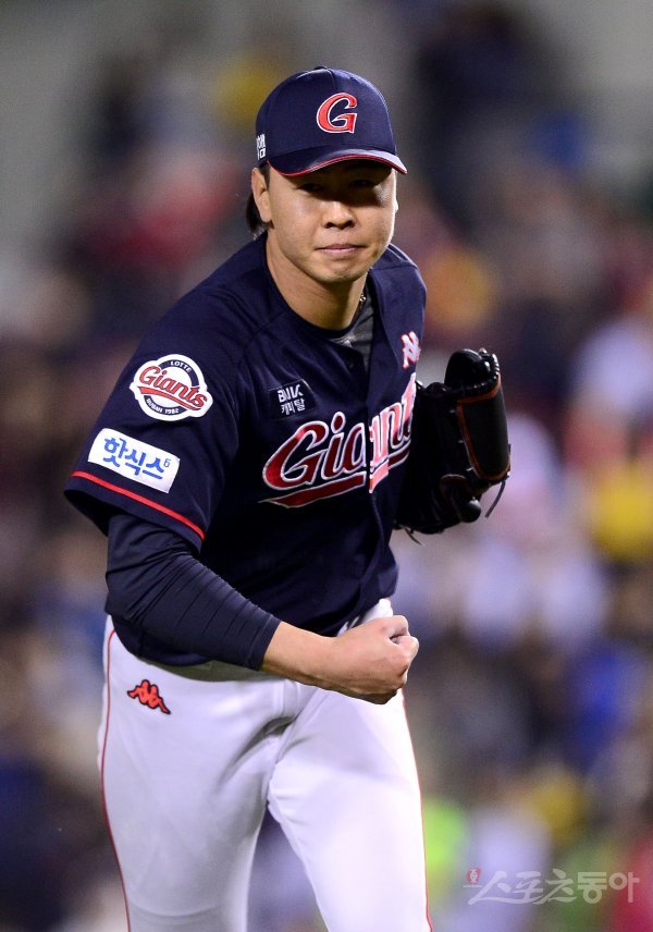 8일 서울 잠실야구장에서 ‘2018 신한은행 MY CAR KBO리그’ 롯데자이언츠와 LG트윈스 경기가 열렸다. 8회말 2사 만루 롯데 진명호가 LG 김용의를 삼진 아웃시킨 후 기뻐하고 있다.
