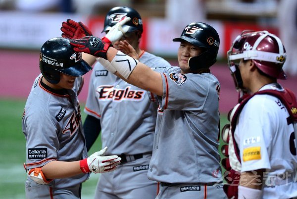8일 서울 고척스카이돔에서 ‘2018 신한은행 마이카 KBO리그’ 넥센 히어로즈와 한화 이글스의 경기가 열렸다. 9회초 무사 1루에서 한화 정은원이 넥센 마무리 조상우를 상대로 중월 투런 홈런을 쏘아 올린 뒤 최재훈의 환영을 받고 있다.