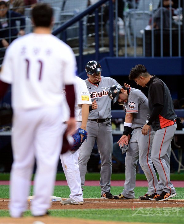 8일 서울 고척스카이돔에서 ‘2018 신한은행 마이카 KBO리그’ 넥센 히어로즈와 한화 이글스의 경기가 열렸다. 9회초 무사에서 한화 이용규가 넥센 마무리 조상우의 볼에 맞은 뒤 고통을 호소하고 있다.