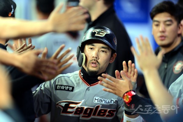 8일 서울 고척스카이돔에서 ‘2018 신한은행 마이카 KBO리그’ 넥센 히어로즈와 한화 이글스의 경기가 열렸다. 9회초2사 1, 3루에서 한화 김태균의 적시타 때 득점에 성공한 이용규가 동료들의 환영을 받고 있다.