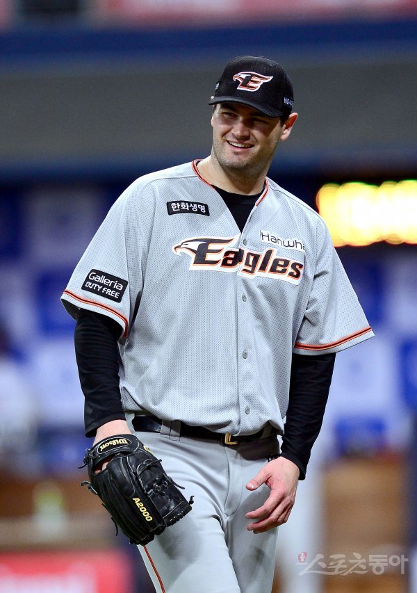 9일 서울 고척스카이돔에서 ‘2018 신한은행 MY CAR KBO리그’ 한화이글스와 넥센히어로즈 경기가 열렸다. 선발 투수로 등판한 한화 휠러가 4회까지 무실점으로 막은 후 웃으며 더그아웃으로 향하고 있다.