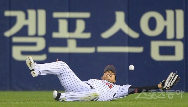 9일 서울 잠실야구장에서 ‘2018 신한은행 MY CAR KBO리그’ 롯데자이언츠와 LG트윈스 경기가 열렸다. 6회초 1사 LG 우익수 채은성이 롯데 이대호의 타구를 잡기 위해 몸을 날렸으나 잡지 못하고 있다.