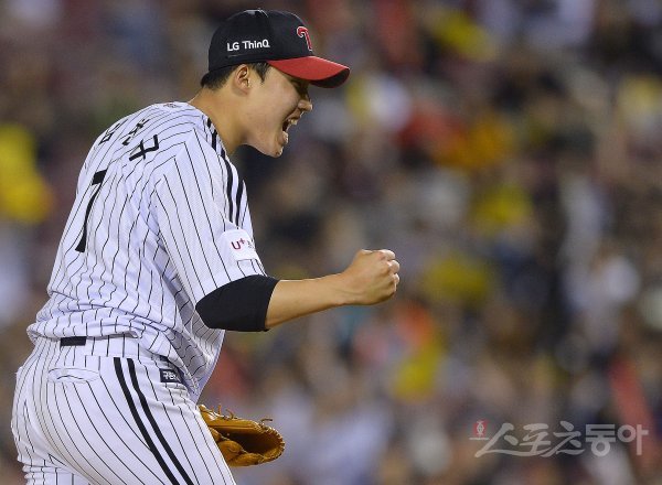 9일 서울 잠실야구장에서 ‘2018 신한은행 MY CAR KBO리그’ 롯데자이언츠와 LG트윈스 경기가 열렸다. 6회초 2사 1,3루에서 LG 선발 임찬규가 롯데 번즈를 투수 앞 땅볼로 잡아낸 후 포효하고 있다.