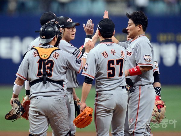 9일 서울 고척스카이돔에서 ‘2018 신한은행 MY CAR KBO리그’ 한화이글스와 넥센히어로즈 경기가 열렸다. 4-1 승리를 거둔 한화 선수들이 하이파이브 하고 있다.