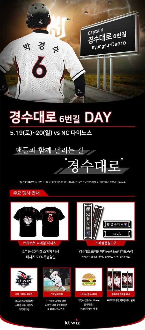 또, 경기를 관람하는 팬을 대상으로 경수대로 표지판을 형상화한 응원 막대(경기당 1,000개)와 플래카드(경기당 3,000개)를 증정하고 외야에서는 대형 깃발을 활용한 응원전도 연다. 수원 KT 위즈파크를 지나는 경수대로의 가로등(총 27개)에도 대형 배너를 설치해 이 날 행사를 알린다.