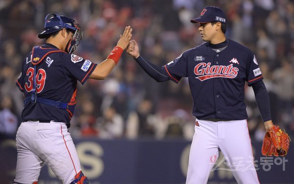 10일 서울 잠실야구장에서 열린 ‘2018 신한은행 MY CAR KBO리그’ 롯데자이언츠와 LG트윈스 경기에서 롯데가 7-2로 승리했다. 경기 후 롯데 나종덕과 배장호(오른쪽)가 하이파이브를 나누고 있다.