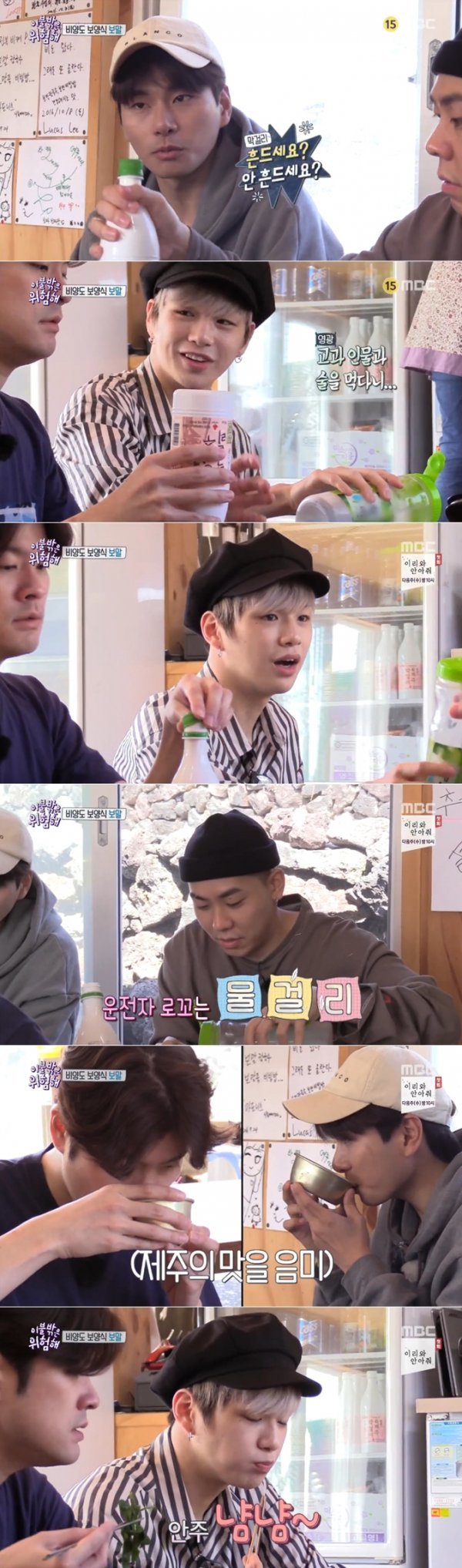 이날 비양도에 도착한 멤버들은 보말 음식점으로 향했다. 이들은 보말 요리를 기다리면서 막걸리를 마셨다. 운전을 해야 하는 로꼬는 물로 잔을 채워 기분을 냈다. 강다니엘은 “교과 인물과 술을 마시다니”라면서 감격스러워했다.