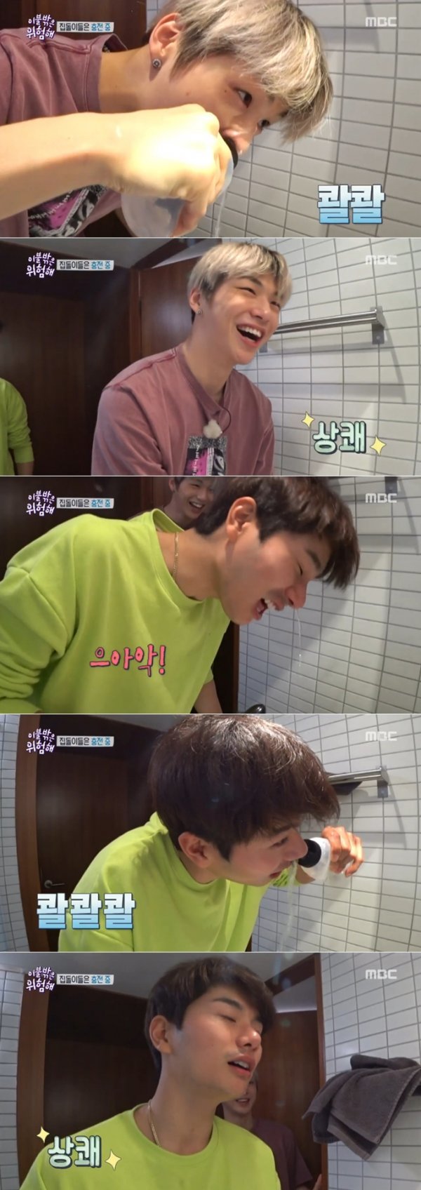 강다니엘은 샤워를 마친 후 이이경에게 “멤버 재환이가 알려준 것”이라면서 코 세척기를 소개했다. 그는 이미지를 내려놓고 시원하게 코 세척법을 선보였다. 초보자 이이경은 강다니엘을 따라 코를 세척하면서 고통스러워했다. 하지만 이내 코가 뻥 뚤리는 시원함에 미소 지었다.