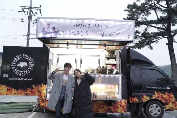 한가인과 이희준의 소속사 BH엔터테인먼트에 따르면 인증샷 속 두 사람은 ‘세연이와 상훈이가 전 스태프를 응원합니다”라는 현수막 아래 다정한 모습으로 포즈를 취하고 있다. 일교차가 큰 날씨에 밤낮으로 고생하는 드라마 스태프들과 동료 배우들을 위해 두 배우가 의기투합해 간식차를 마련한 것.