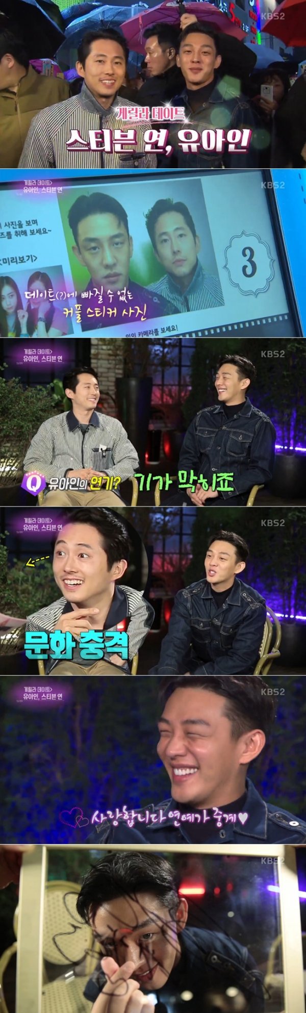 11일 방송된 KBS2 ‘연예가중계’에서는 영화 ‘버닝’의 유아인과 스티븐 연의 게릴라 데이트가 공개됐다. 비 내리는 날 홍대 거리에서 팬들과 만난 유아인과 스티븐 연은 환호 이상의 괴성을 받으면서 팬들의 기운을 받았다.