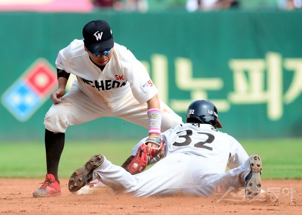 13일 인천 SK행복드림구장에서 ‘2018 신한은행 마이카 KBO리그’ SK 와이번스와 LG 트윈스의 경기가 열렸다. 5회초 2사 1루에서 LG 정주현 타석 때 1루 주자 이천웅이 2루 도루에 성공하고 있다.