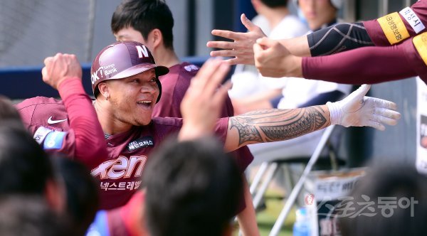 13일 서울 잠실야구장에서 ‘2018 신한은행 MY CAR KBO리그’ 넥센히어로즈와 두산베어스 경기가 열렸다. 6회초 2사 넥센 초이스가 좌월 솔로 홈런을 날리고 그라운드를 돌아 홈인해 하이파이브 하고 있다.