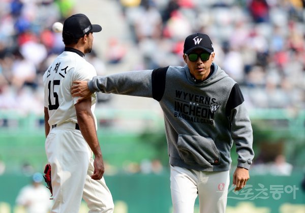 13일 인천 SK행복드림구장에서 ‘2018 신한은행 마이카 KBO리그’ SK 와이번스와 LG 트윈스의 경기가 열렸다. 6회초 SK 김광현을 구원 등판한 산체스가 손혁 코치의 격려를 받고 있다.