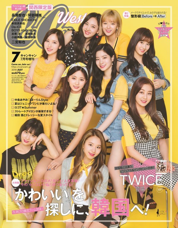 아울러 23일 일본서 발매되는 유명 패션지 \'CanCam\' 7월호의 전국판과 칸사이 한정반 등 두 권의 표지 모델을 장식해 화제다. 특히 일본 여성 패션지로는 처음으로 전국판과 함께 칸사이 한정반이 동시 발매되는 가운데 모두 트와이스가 표지를 장식, 현지에 뜨거운 트와이스의 인기를 실감케 하는 사례로 인정받고 있다. 매거진이 발매되는 23일부터 약 일주일간 도쿄 하라주쿠와 오사카의 아메리카무라 등 대표적 패션 거리에 트와이스의 \'CanCam\' 포스터가 등장할 예정이다.