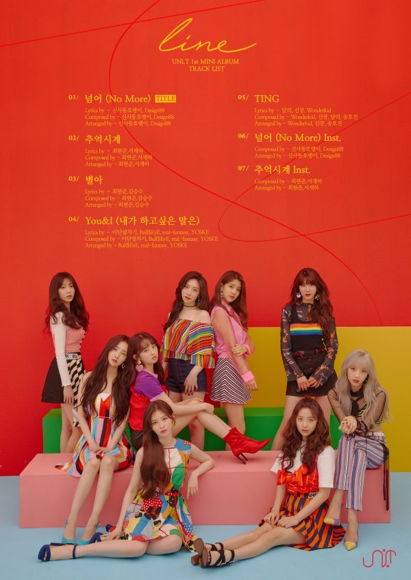UNI.T 1st MINI ALBUM ‘line’은 유니티의 출발 선을 뜻하며 그 동안 깨지 못했던 경계를 넘어서겠다는 확고한 의지를 담았고 타이틀 곡 ‘넘어 (No More)’는 신사동호랭이와 신예 작곡가 Design88이 프로듀싱 했다.