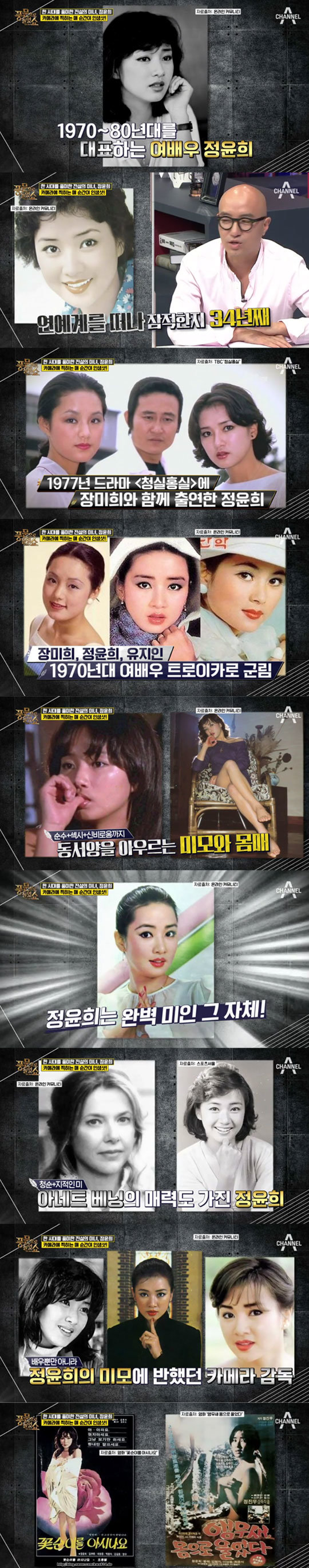 다른 연예부 기자는 정윤희의 근황에 대해 "2013년에 정윤희의 근황이 포착이 됐는데, 검소하고 소박한 모습이었다. 여전히 미모는 빛이 났다"고 설명했다.