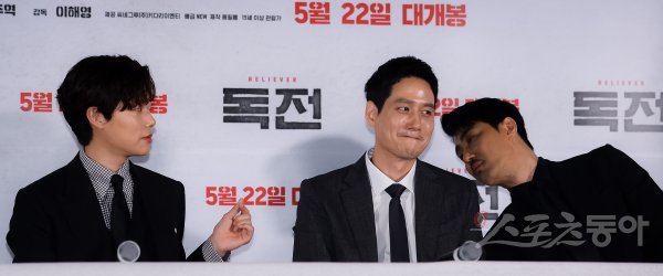 배우 류준열이 15일 서울 광진구 롯데시네마 건대입구에서 열린 영화 ‘독전’ 언론시사회 및 기자간담회에 참석해 차승원(오른족)에게 손가락 하트를 내밀고 있다.