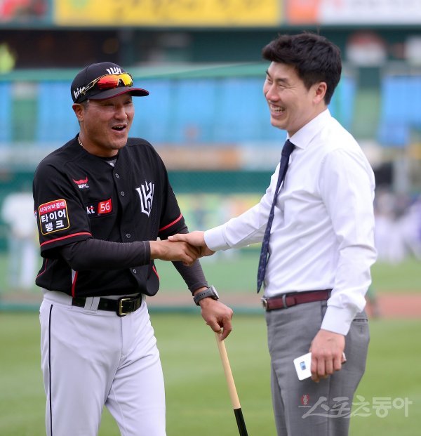 15일 대전 한화생명이글스파크에서 ‘2018 신한은행 MY CAR KBO리그’ kt위즈와 한화이글스 경기가 열렸다. 경기 전 kt 최태원 코치와 장성호 해설위원이 인사를 나누고 있다.