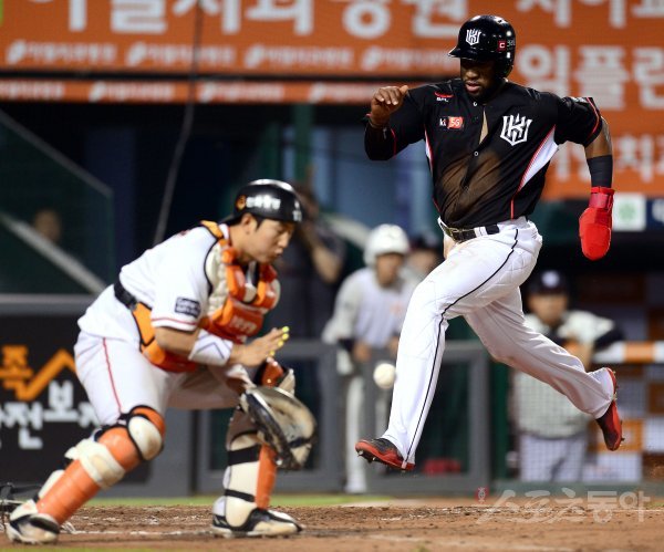 15일 대전 한화생명이글스파크에서 ‘2018 신한은행 MY CAR KBO리그’ kt위즈와 한화이글스 경기가 열렸다. 5회초 2사 2루 kt 박기혁 중전 안타 때 2루주자 로하스가 홈으로 달려 세이프 되고 있다.