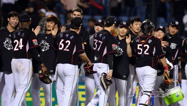 15일 대전 한화생명이글스파크에서 ‘2018 신한은행 MY CAR KBO리그’ kt위즈와 한화이글스 경기가 열렸다. 3-0 승리를 거둔 kt 선수들이 하이파이브 하고 있다.