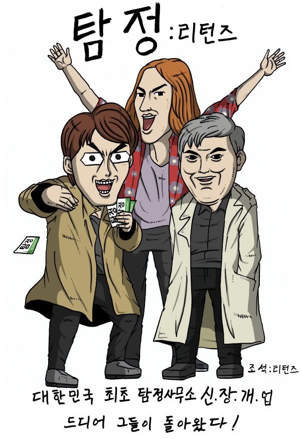 공개된 캐리커처는 조석 작가 특유의 작화 분위기와 ‘탐정: 리턴즈’ 속 캐릭터들이 만나 코믹 시너지를 발산한다. 먼저 “맡겨만 주십시오!”라며 허세스럽게 다리를 꼬고 있는 ‘강대만’은 셜록 덕후로서 추리 하나는 기가 막히게 해내는 그의 자신감을 느끼게 한다. 이어 “나야 뭐 베테랑이니까~”라는 문구와 함께 여유 넘치는 모습을 보여주는 ‘노태수’는 레전드 형사로 이름을 날렸던 인물의 강렬한 포스를 자아낸다. 여기에 “형, 저 멘사에요!”라며 남다른 천재성을 드러내는 ‘여치’는 최강 추리 콤비 ‘강대만’, ‘노태수’와 함께 어떤 활약을 펼치게 될지 궁금증을 높인다. 뿐만 아니라 ‘강대만’, ‘노태수’, ‘여치’가 함께 있는 캐리커처는 세 사람의 찰떡 케미로 시선을 사로잡으며, “대한민국 최초 탐정사무소 신.장.개.업 드디어 그들이 돌아왔다!”라는 문구로 트리플 콤비의 귀환을 알려 기대를 더한다.