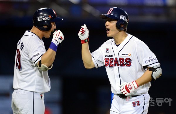 16일 서울 잠실야구장에서 ‘2018 신한은행 마이카 KBO리그’ 두산 베어스와 SK 와이번스의 경기가 열렸다. 2회말 1사에서 두산 김재호가 SK 선발 산체스를 상대로 좌월 솔로 홈런을 쏘아 올린 뒤 김인태의 환영을 받고 있다.