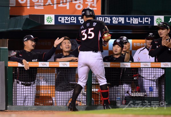 16일 대전 한화생명이글스파크에서 ‘2018 신한은행 MY CAR KBO리그’ kt위즈와 한화이글스 경기가 열렸다. 4회초 1사 1루 kt 이진영이 좌월 투런 홈런을 날리고 그라운드를 돌아 홈인해 김진욱 감독의 축하를 받고 있다.