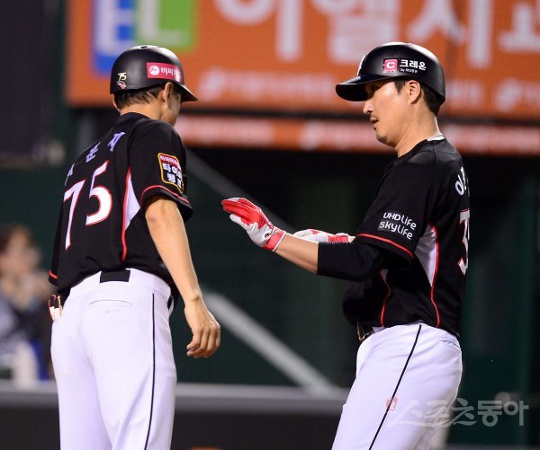 16일 대전 한화생명이글스파크에서 ‘2018 신한은행 MY CAR KBO리그’ kt위즈와 한화이글스 경기가 열렸다. 4회초 1사 1루 kt 이진영이 좌월 투런 홈런을 날리고 그라운드를 돌아 홈인해 하이파이브 하고 있다.