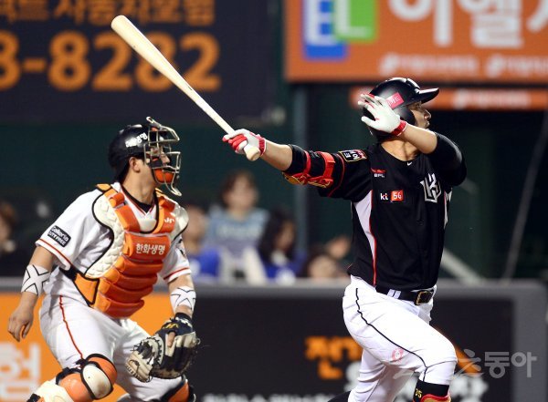 16일 대전 한화생명이글스파크에서 ‘2018 신한은행 MY CAR KBO리그’ kt위즈와 한화이글스 경기가 열렸다. 4회초 1사 1루 kt 이진영이 좌월 투런 홈런을 날리고 있다.