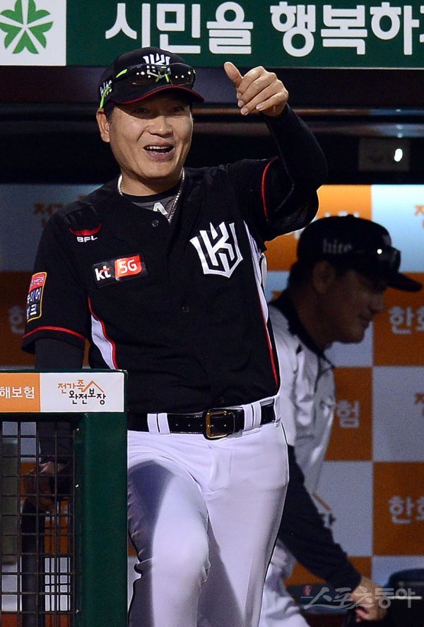 16일 대전 한화생명이글스파크에서 ‘2018 신한은행 MY CAR KBO리그’ kt위즈와 한화이글스 경기가 열렸다. 4회초 1사 2루 kt 황재균이 1타점 우전 안타를 치자 더그아웃의 채종범 코치가 엄지손가락을 들어 보이고 있다.
