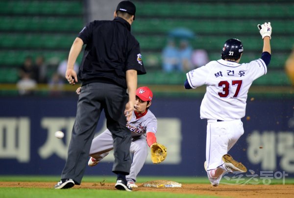 16일 서울 잠실야구장에서 ‘2018 신한은행 마이카 KBO리그’ 두산 베어스와 SK 와이번스의 경기가 열렸다. 8회말 2사 1루에서 두산 양의지 타석 때 1루 주자 박건우가 2루 도루를 시도했으나 SK 김성현에게 태그 아웃되고 있다.