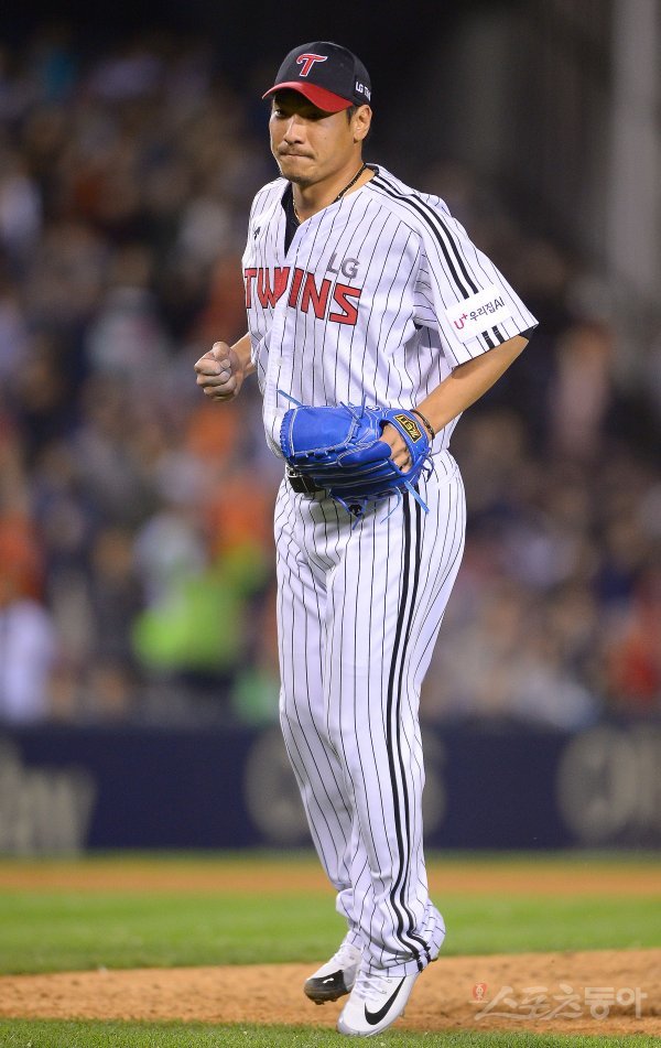 8회초 LG 이동현이 무실점으로 이닝을 마친 후 주먹을 불끈 쥐며 기뻐하고 있다.