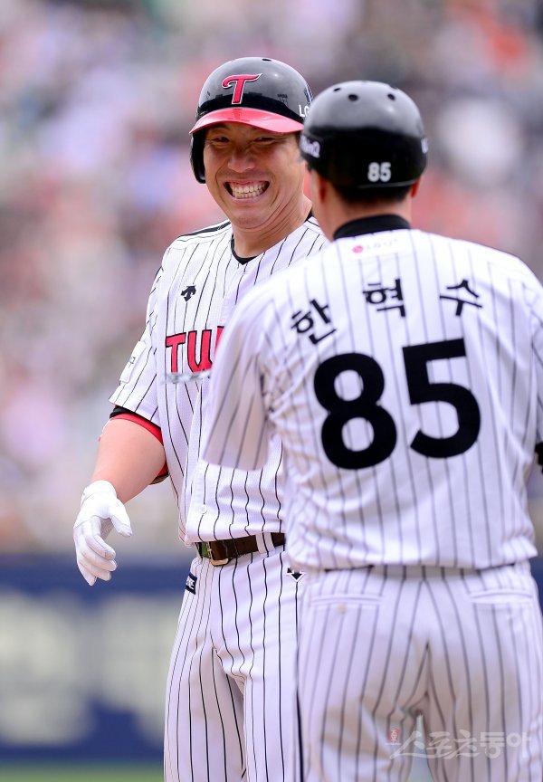 20일 서울 잠실야구장에서 ‘2018 신한은행 MY CAR KBO리그’ 한화이글스와 LG트윈스 경기가 열렸다. 2회말 1사 1루 LG 김현수가 행운의 중전 안타를 치고 있다.