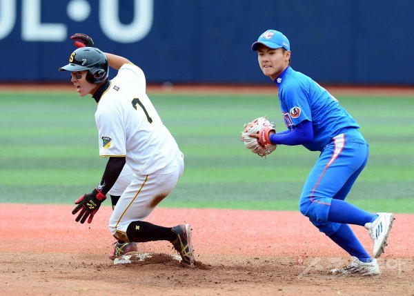 20일 서울 목동야구장에서 ‘제 72회 황금사자기 전국고교야구대회’ 효천고와 상우고의 경기가 열렸다. 6회말 1사 1루에서 상우고 나호채의 내야땅볼 때 1루 주자 김태성이 2루에서 세이프 되고 있다.