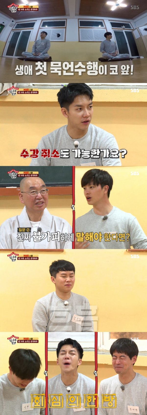 ‘집사부일체’ 멤버들과 저녁 식사를 마친 법륜스님은 “자아성찰을 위해 묵언수행을 하자”라고 말했다. 이승기와 양세형은 사색하며 묵언수행 하기를 꺼려했다. 심지어 이승기는 “수강 취소가 가능한가?”라고 물어 웃음을 자아냈다.