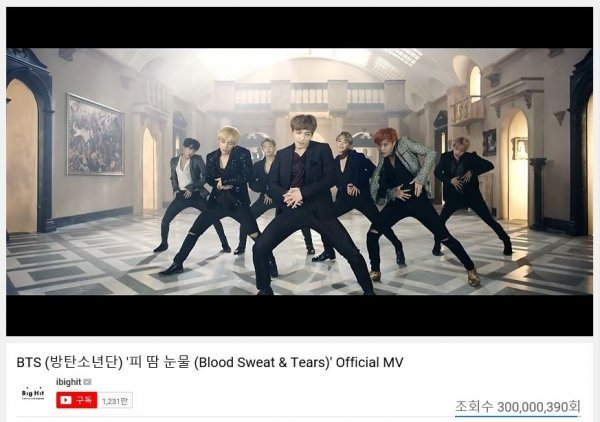 그룹 방탄소년단의 ‘피 땀 눈물’ 뮤직비디오 조회수가 3억뷰를 돌파하는 기염을 토했다.