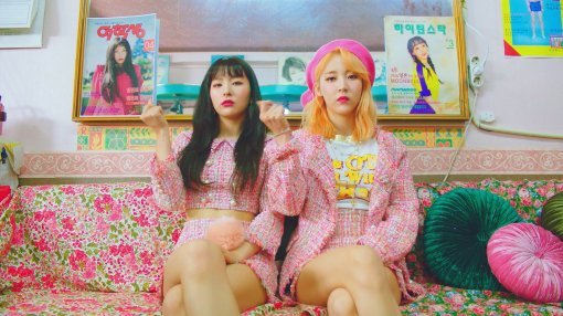 레트로한 감성이 묻어나는 배경 속에서 문별과 슬기는 마치 쌍둥이처럼 트윈룩 패션과 똑같은 동작으로 눈길을 끈다.