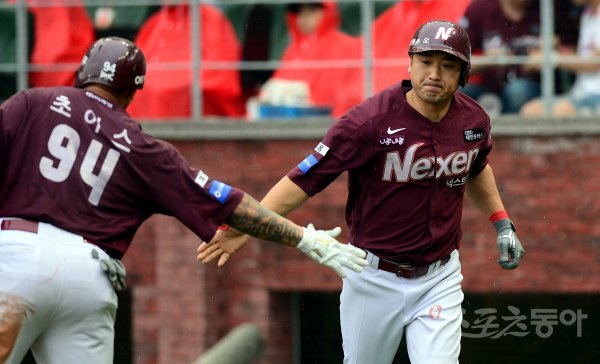 22일 인천 SK행복드림구장에서 ‘2018 신한은행 마이카 KBO리그’ SK 와이번스와 넥센 히어로즈의 경기가 열렸다. 7회초 무사에서 넥센 이택근이 SK 백인식을 상대로 우월 솔로 홈런을 쏘아 올린 뒤 초이스의 환영을 받고 있다.