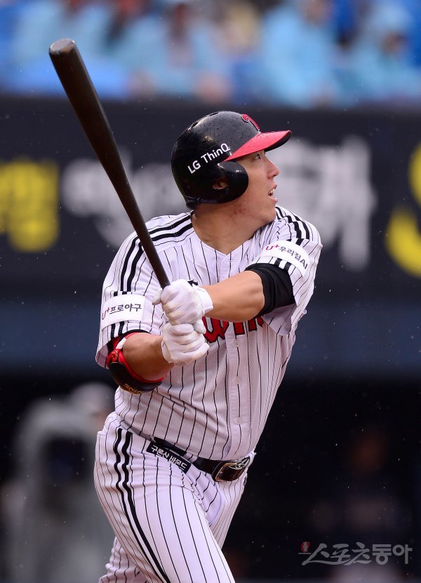 22일 서울 잠실야구장에서 ‘2018 신한은행 MY CAR KBO리그’ NC다이노스와 LG트윈스 경기가 열렸다. 6회말 무사 2,3루 LG 김현수 1타점 외야플라이를 치고 있다.