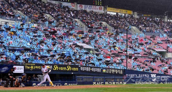 22일 서울 잠실야구장에서 ‘2018 신한은행 MY CAR KBO리그’ NC다이노스와 LG트윈스 경기가 비가 내리는 가운데 열리고 있다.
