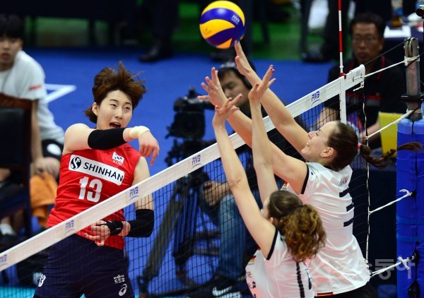 22일 경기도 수원실내체육관에서 ‘2018 발리볼네이션스리그’ 한국과 독일의 여자배구 예선경기가 열렸다. 한국 박정아가 독일 블로커를 피해 스파이크를 날리고 있다.