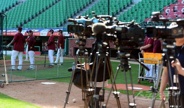 23일 인천 SK행복드림구장에서 ‘2018 신한은행 마이카 KBO리그’ SK 와이번스와 넥센 히어로즈의 경기가 열린다. 박동원, 조상우 성폭행 혐의에 방송카메라들이 넥센을 취재하고 있다. KBO는 성폭행 혐의를 받고 있는 넥센 박동원과 조상우에 대해 참가활동정지 처분을 내렸다.