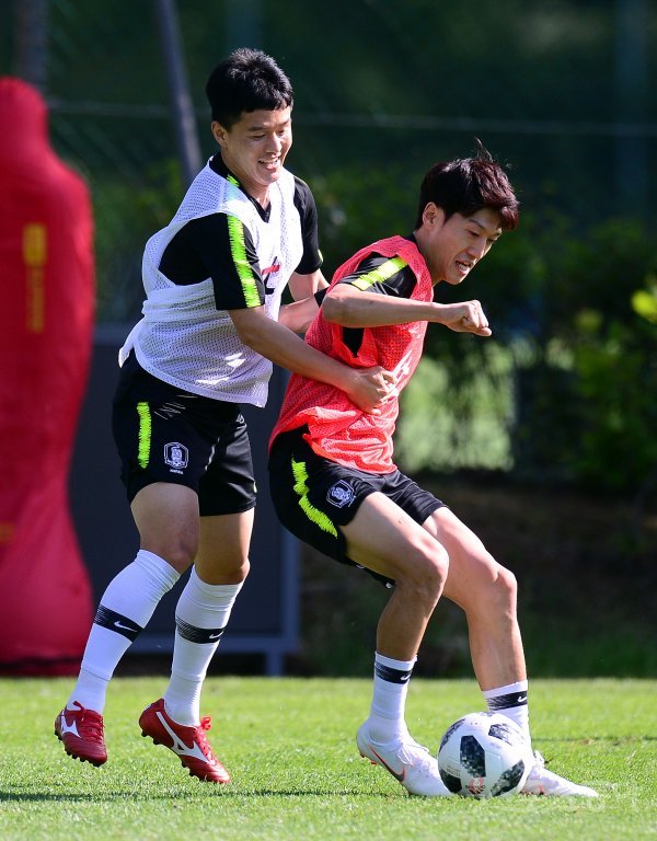 2018 러시아월드컵을 대비하는 축구대표팀이 23일 파주 국가대표트레이닝센터(NFC)에서 훈련을 가졌다. 대표팀 주세종과 이청용이 볼뺏기 게임을 하고 있다.