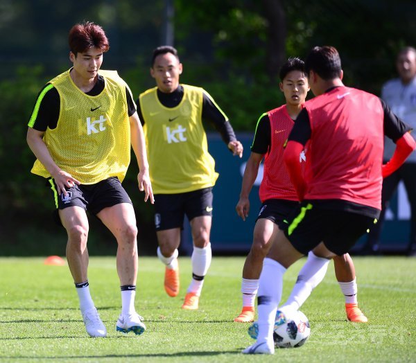 2018 러시아월드컵을 대비하는 축구대표팀이 23일 파주 국가대표트레이닝센터(NFC)에서 훈련을 가졌다. 대표팀 기성용과 이승우가 볼뺏기 게임을 하고 있다.