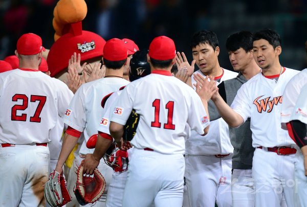 23일 인천 SK행복드림구장에서 ‘2018 신한은행 마이카 KBO리그’ SK 와이번스와 넥센 히어로즈의 경기가 열렸다. SK가 넥센에 13-2로 승리하며 6연패 탈출에 성공한 뒤 선수들이 그라운드에서 기쁨을 나누고 있다.