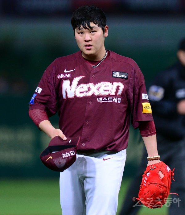 24일 인천 SK행복드림구장에서 ‘2018 신한은행 마이카 KBO리그’ SK 와이번스와 넥센 히어로즈의 경기가 열렸다. 넥센 선발투수 한현희가 5회까지 SK 공격을 3실점으로 막은 뒤 이닝 종료 후 더그아웃으로 향하고 있다.