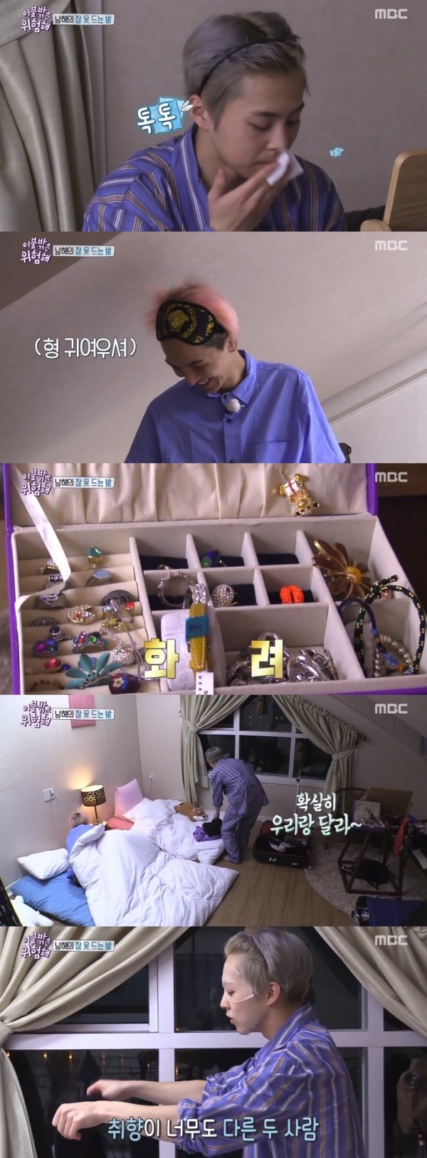 이런 가운데 시우민 역시 송민호의 온갖 액세서리가 달린 보석함을 발견했다. 그는 “확실히 우리하고는 다르다. 우리는 잘 신경을 쓰지 않는다”며 신기해 했다.